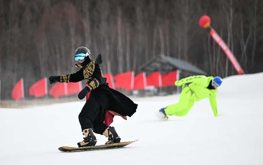 2024年11月10日,滑雪爱好者在阿尔山市太伟滑雪场滑行。