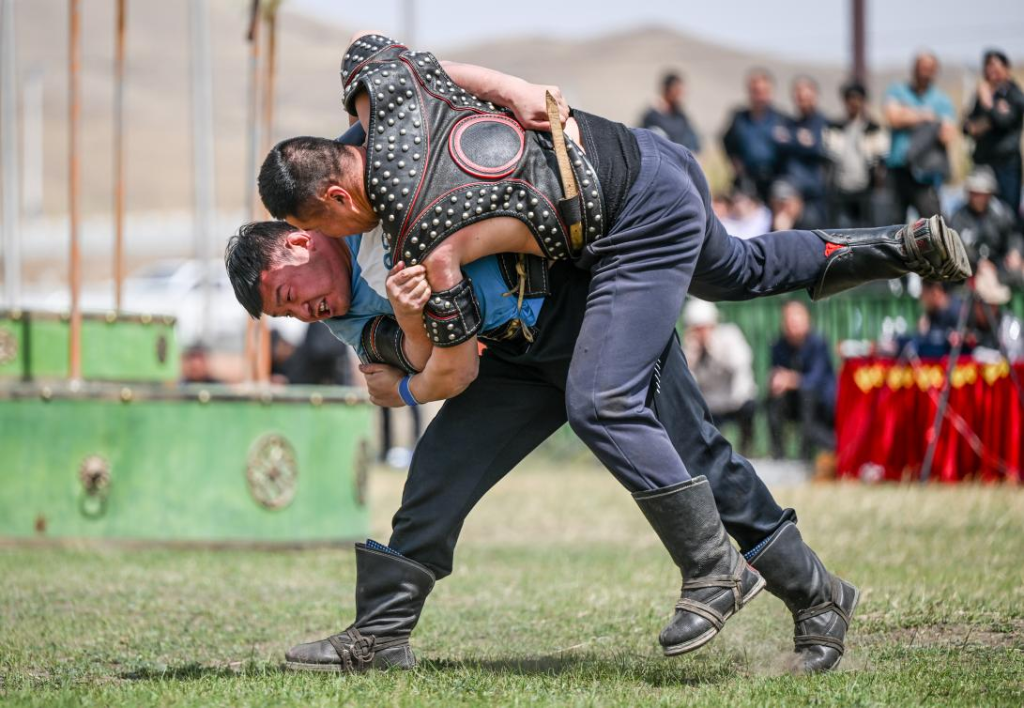 2023年5月16日,选手们在搏克比赛中。当日,科尔沁右翼前旗乌兰毛都草原上举办了丰富多彩的那达慕。