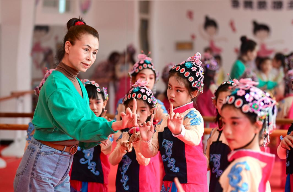 2023年5月17日,乌兰浩特市山城路小学教师在“戏曲传承进校园 梨园雅韵润童心”主题活动中指导学生戏曲动作。