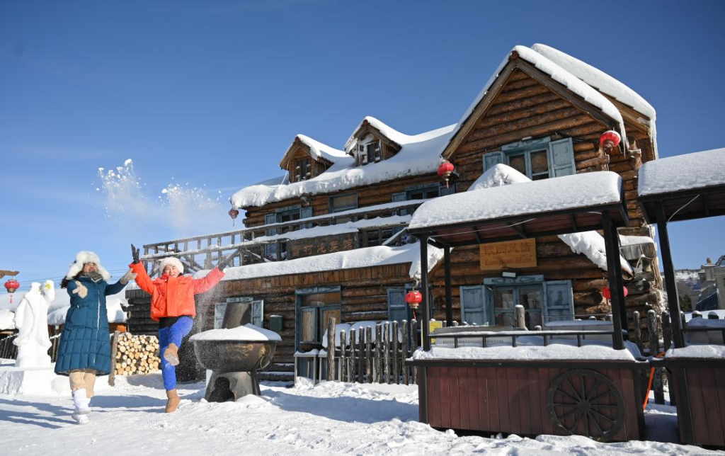 2023年12月14日,游客在阿尔山市雪村内游玩。