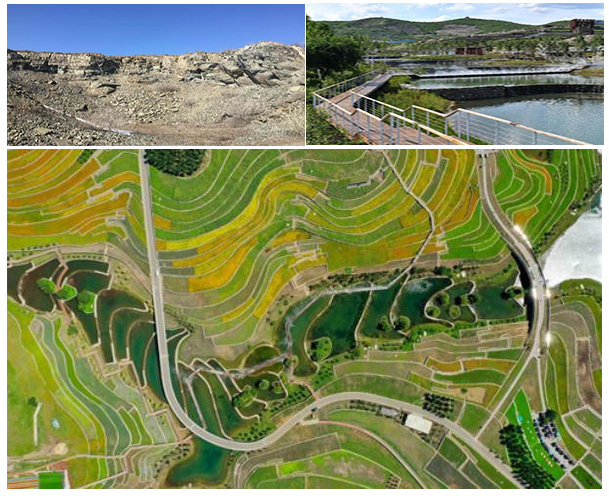左上:乌兰浩特市天骏山治理修复前的一处采石场(2017年3月20日摄)。