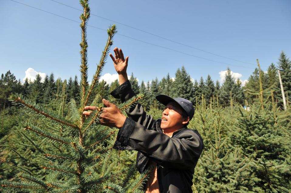 工作人员在阿尔山市五岔沟林业局林木种苗繁育基地查看云杉苗木生长情况(2014年8月30日摄)。