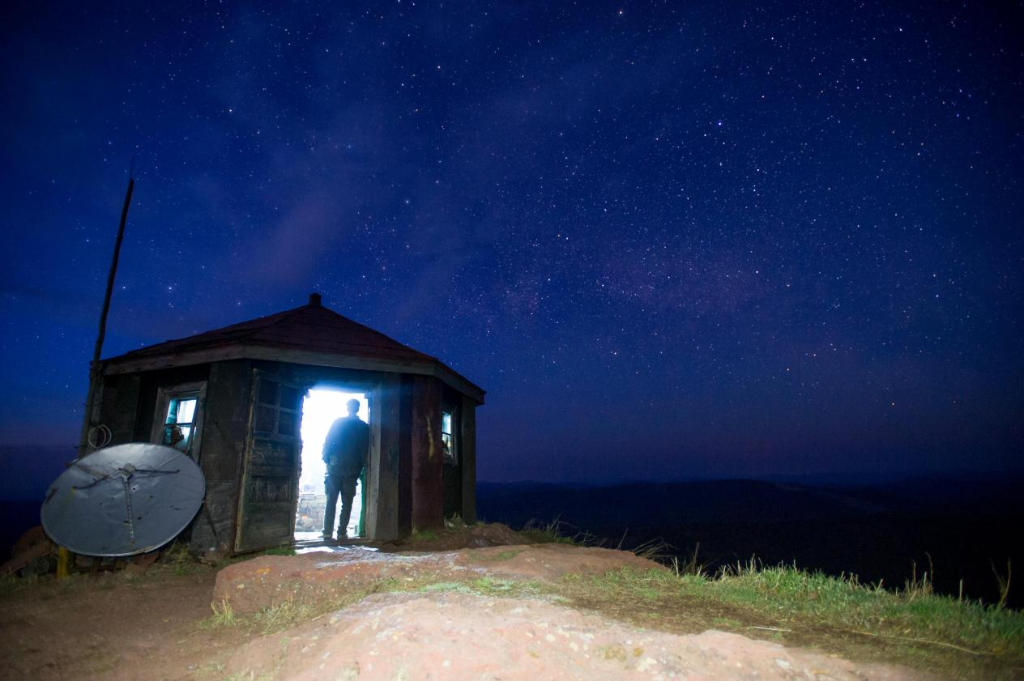 2015年5月22日夜,防火瞭望员王金龙靠在瞭望站门边。阿尔山国家森林公园的特尔美峰上有一座防火瞭望站,阿尔山林业局职工李井泉、朱凤明和王金龙是值守在这里的防火瞭望员。每年3月15日至6月15日,9月15日至11月15日是重要的春秋防火期,全天需要人值守,他们三人倒班,经常在山顶一呆就是半个月。