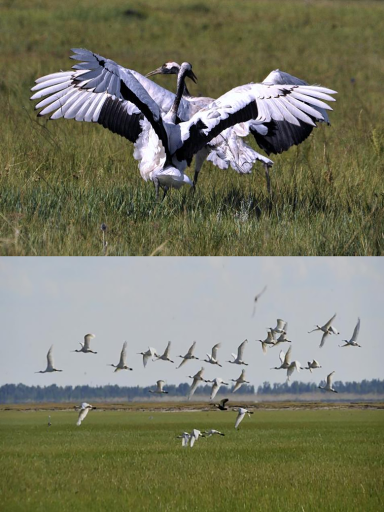 上图:在扎赉特旗境内图牧吉国家级自然保护区湿地上起舞的丹顶鹤(2010年8月24日摄)。