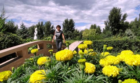 2010年8月25日拍摄的一位突泉县居民从城区的花园中穿过。