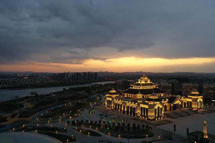 晚霞下的兴安盟乌兰牧骑宫及周边风景(2020年5月2日摄)。