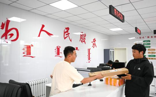 2023年7月5日,在科尔沁右翼前旗满族屯满族乡党群服务中心边境服务站,工作人员(左)将代收的快递交给牧民。