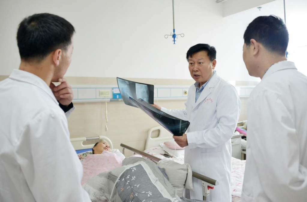 2019年3月16日,在科尔沁右翼中旗人民医院病房,北京市通州区潞河医院骨科主任医师于振山(右二)为当地医生开展业务指导。