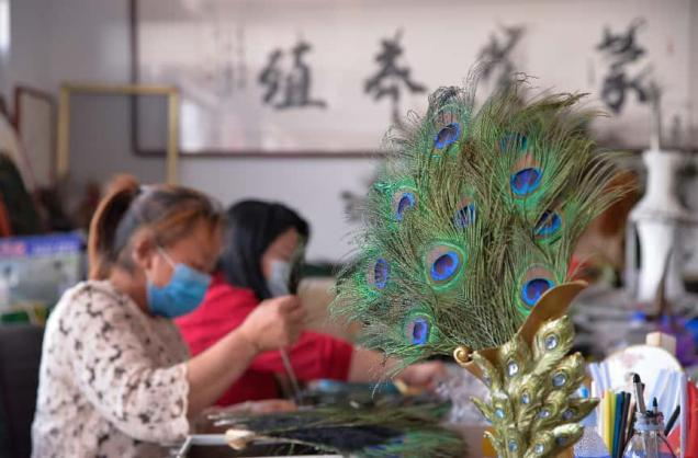 2020年5月1日,周海燕(后)和贫困户姜红梅在位于乌兰浩特市义勒力特嘎查的孔雀观赏园工作室制作孔雀羽毛工艺品。由周海燕和家人共同打造的孔雀观赏园经过十余年的养殖探索,不仅带动乡村旅游发展,还带动本村及周边乡村100多名贫困村民就业增收。