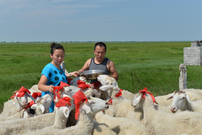 2014年7月24日,包格日乐图和妻子咏梅为准备提供给贫困牧民的杜泊二代寒羊戴红花。