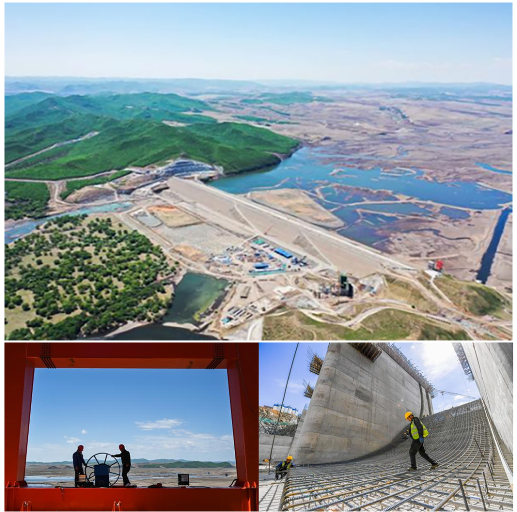 左下、右下:2022年5月21日,在兴安盟,工人在引绰济辽工程文得根水利枢纽施工现场忙碌。