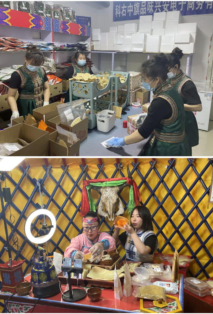 下图:兴安盟一家电商公司的两名工作人员在直播带货(2021年5月12日摄)。