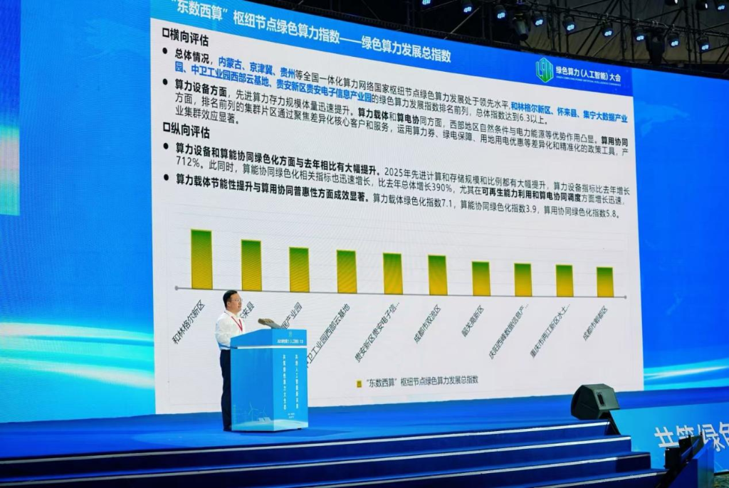 会上,清华大学全球产业研究院副院长、教授李东红对报告进行了发布与解读。报告指出,内蒙古、京津冀、贵州等全国一体化算力网络国家枢纽节点绿色算力发展处于领先水平。和林格尔新区、怀来县、集宁大数据产业园、中卫工业园西部云基地、贵安新区贵安电子信息产业园的绿色算力发展指数排名前列,总体指数达到6.3以上。