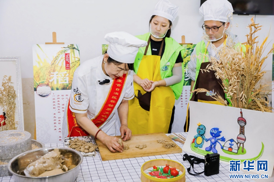 学生们在非遗传承人指导下学习制作莜面。新华网发
