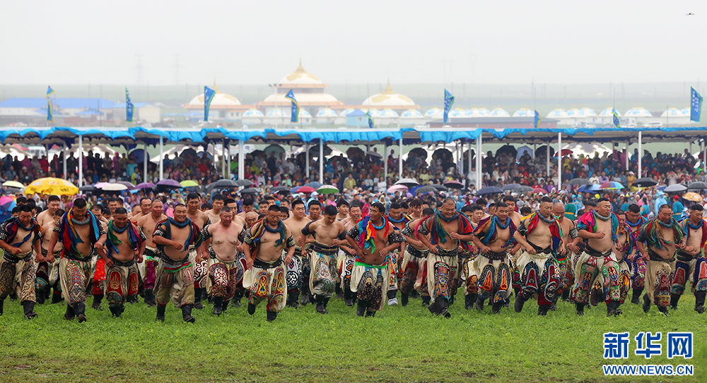 7月19日,内蒙古自治区第35届草原那达慕开幕式现场,搏克手们在入场。新华网 石毅 摄