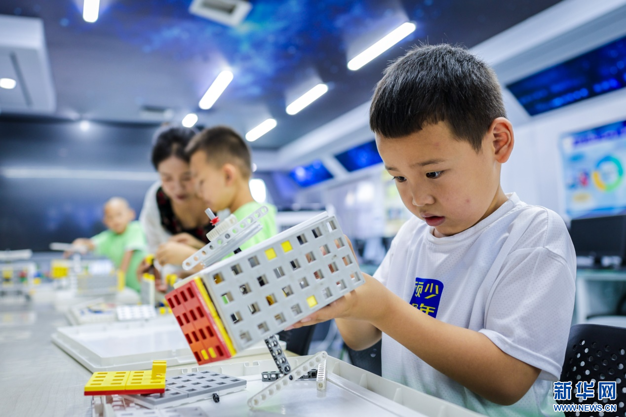 7月20日,孩子们在内蒙古呼和浩特市玉泉区青少年宫学习拼搭创意机器人。新华网发(丁根厚 摄)