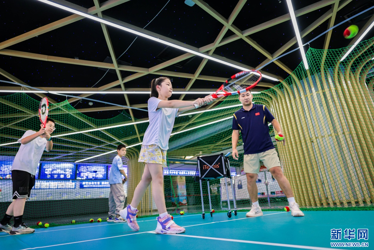 7月20日,孩子们在内蒙古呼和浩特市玉泉区青少年宫参加网球训练。新华网发(丁根厚 摄)