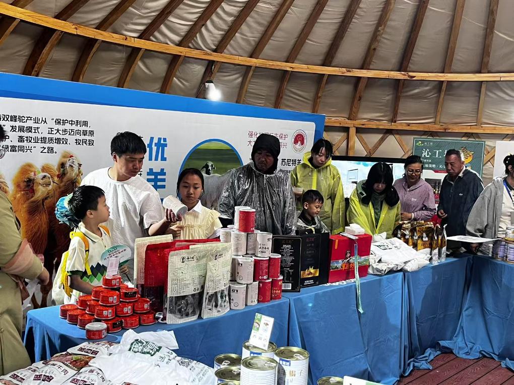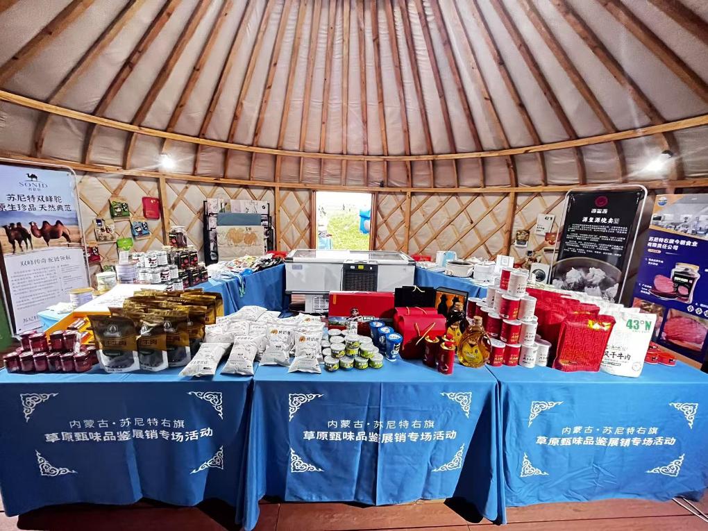 那达慕活动现场,锡林郭勒盟苏尼特右旗设置了“草原甄味品鉴展销专场活动”。展区汇聚了七十余种特色产品,涵盖鲜美的牛羊肉、温暖的绒毛制品、营养丰富的驼奶产品、醇香植物油、有嚼劲的牛肉干与风味独特的牛肉酱,以及琳琅满目的传统奶制品等风味产品。