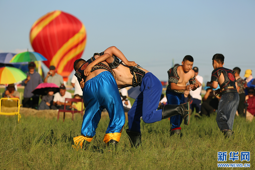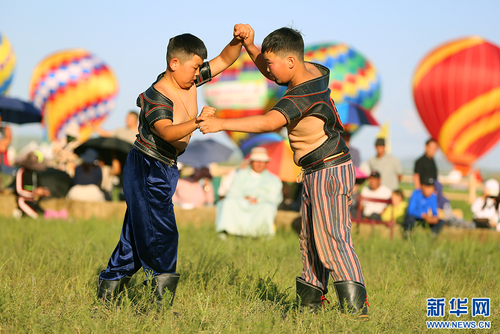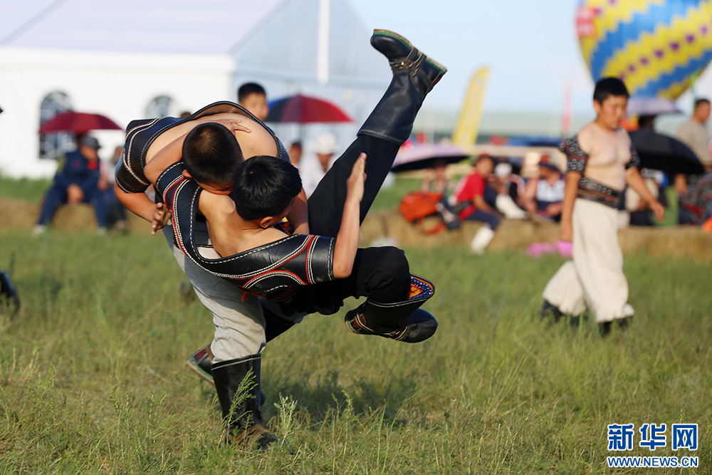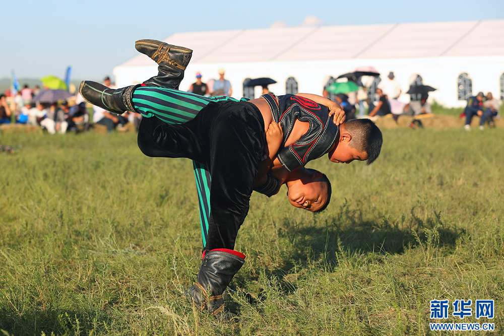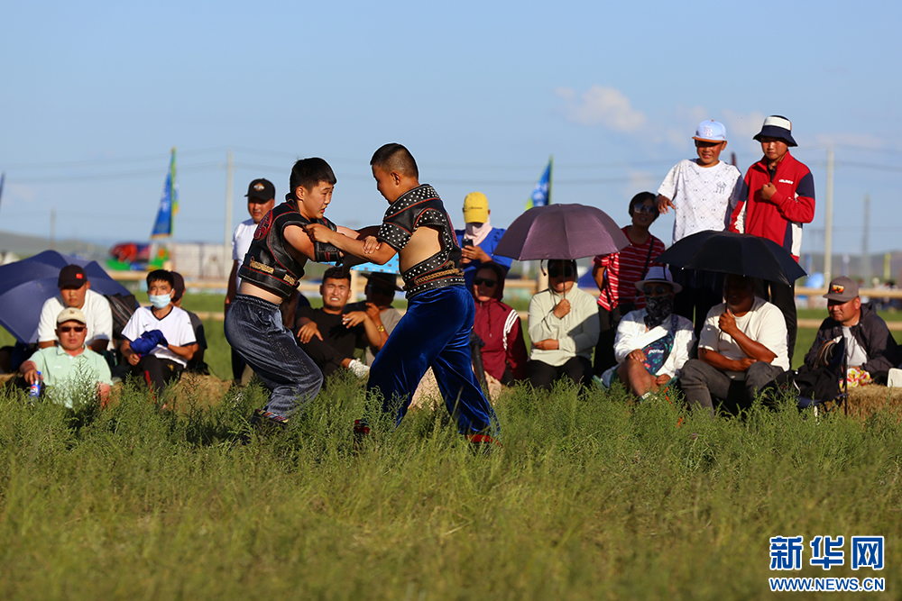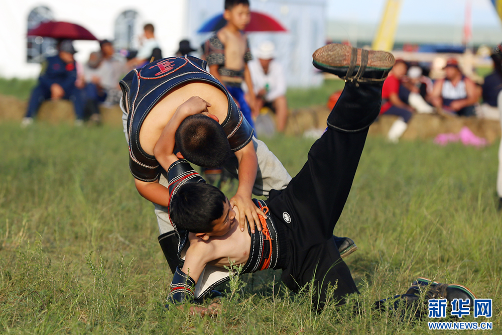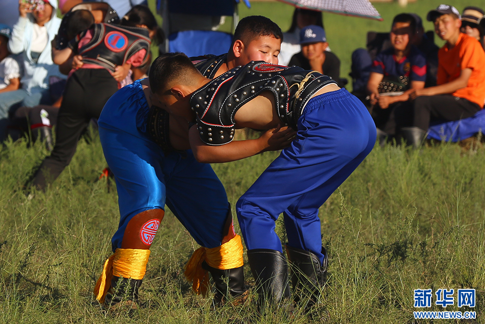 7月20日,内蒙古自治区第35届草原那达慕大会少年搏克比赛瞬间。新华网 石毅摄