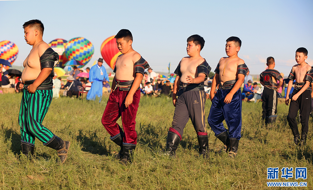 7月20日,小搏克手们踏入内蒙古自治区第35届草原那达慕大会少年搏克比赛赛场。新华网 石毅摄