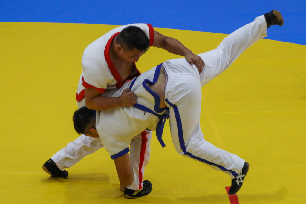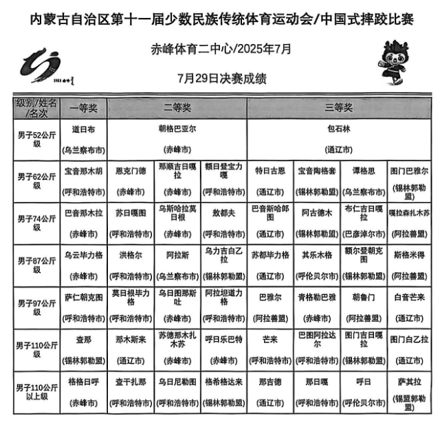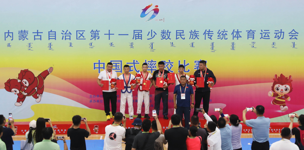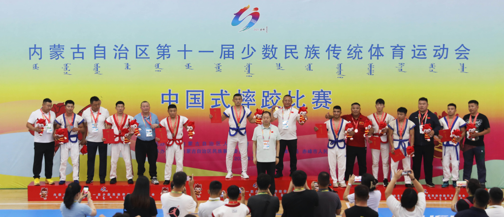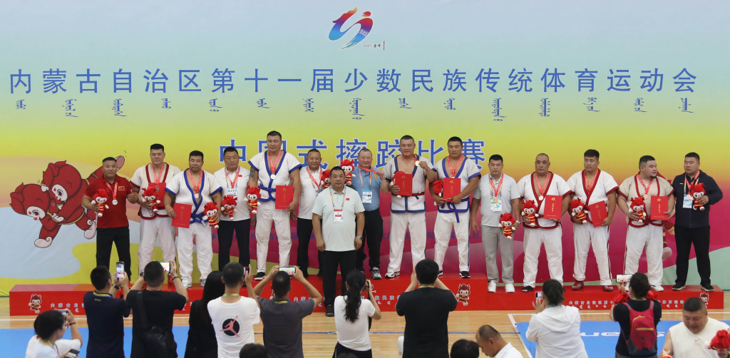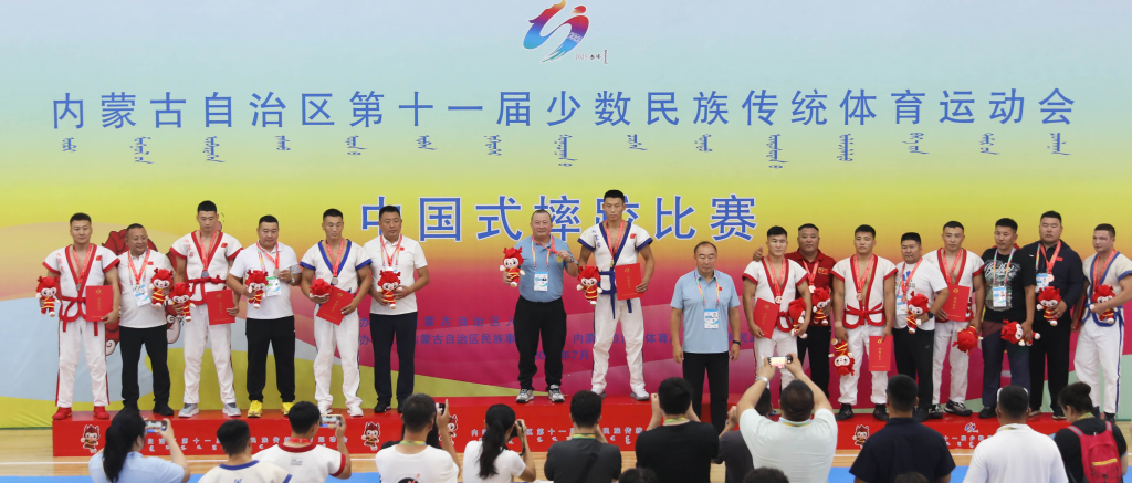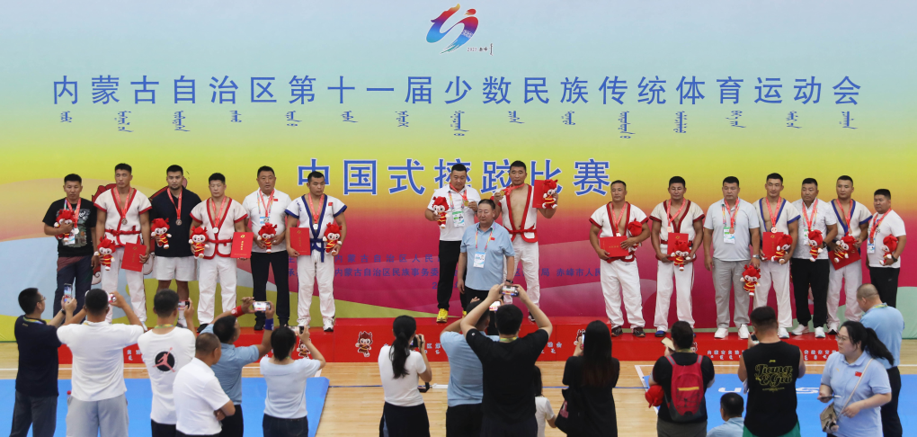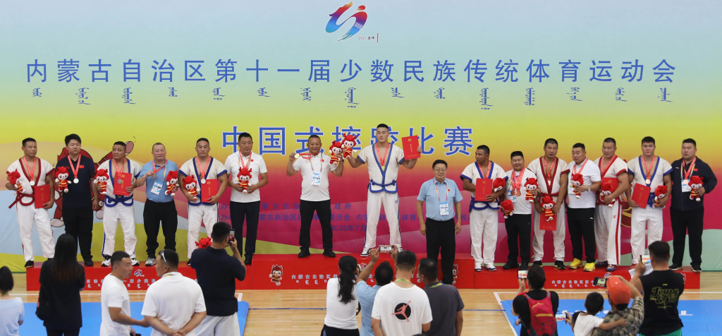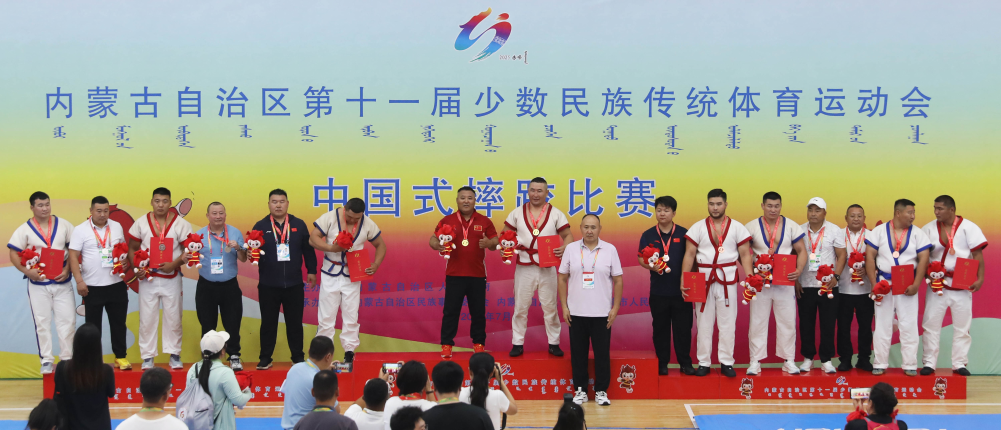 7月29日,内蒙古自治区第十一届少数民族传统体育运动会中国式摔跤比赛在内蒙古赤峰体育二中心体育馆全部结束,并为获得各重量级别的一、二、三等奖选手和教练颁奖。何五昌 摄