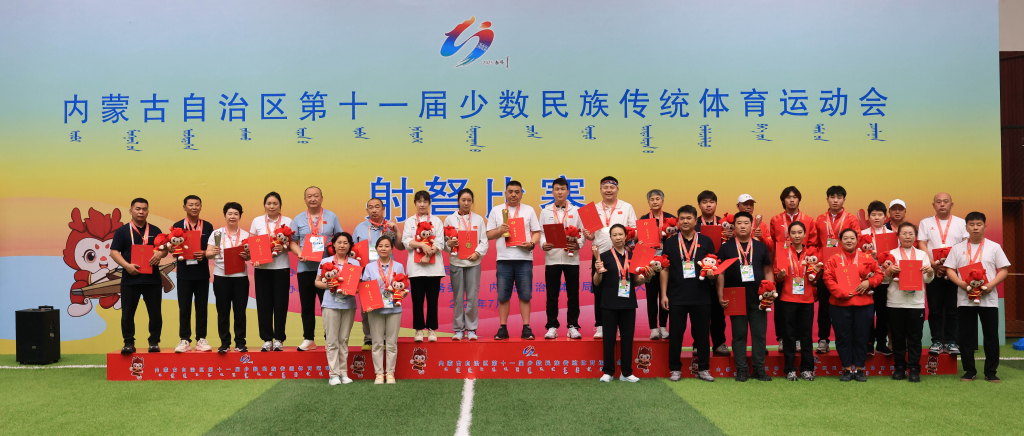 7月29日,获得内蒙古自治区第十一届少数民族传统体育运动会民族标准弩混合团体赛项目比赛一等奖、二等奖、三等奖的选手与教练在颁奖仪式上合影。