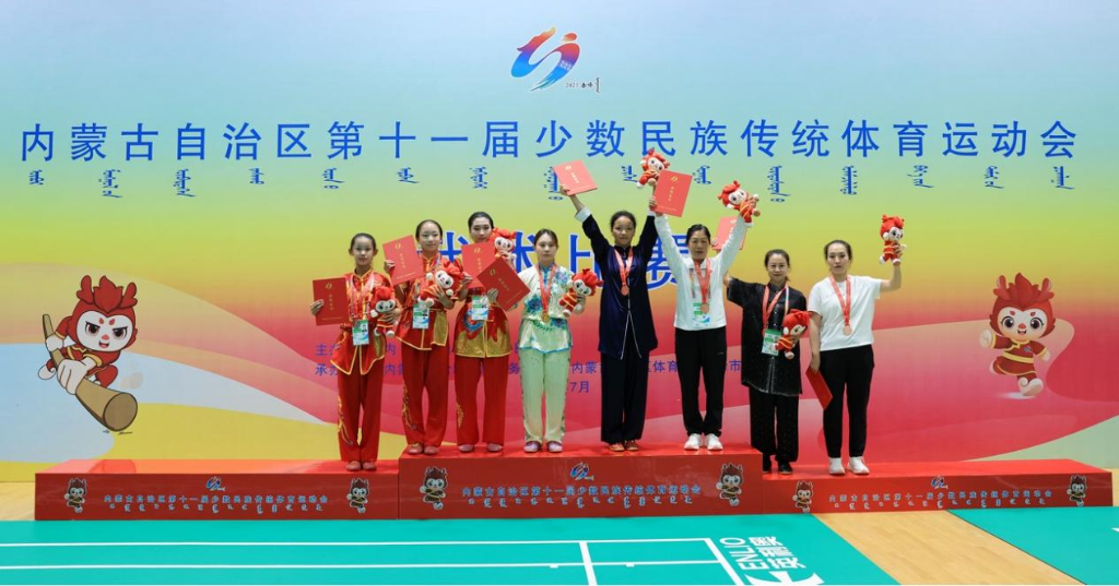当日,获得内蒙古自治区第十一届少数民族传统体育运动会女子传统拳术项目比赛前三名的选手在颁奖仪式上合影。