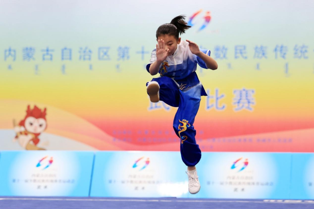 7月27日,内蒙古自治区第十一届少数民族传统体育运动会女子传统拳术决赛在赤峰市红山区全民健身中心举行。李峰 摄
