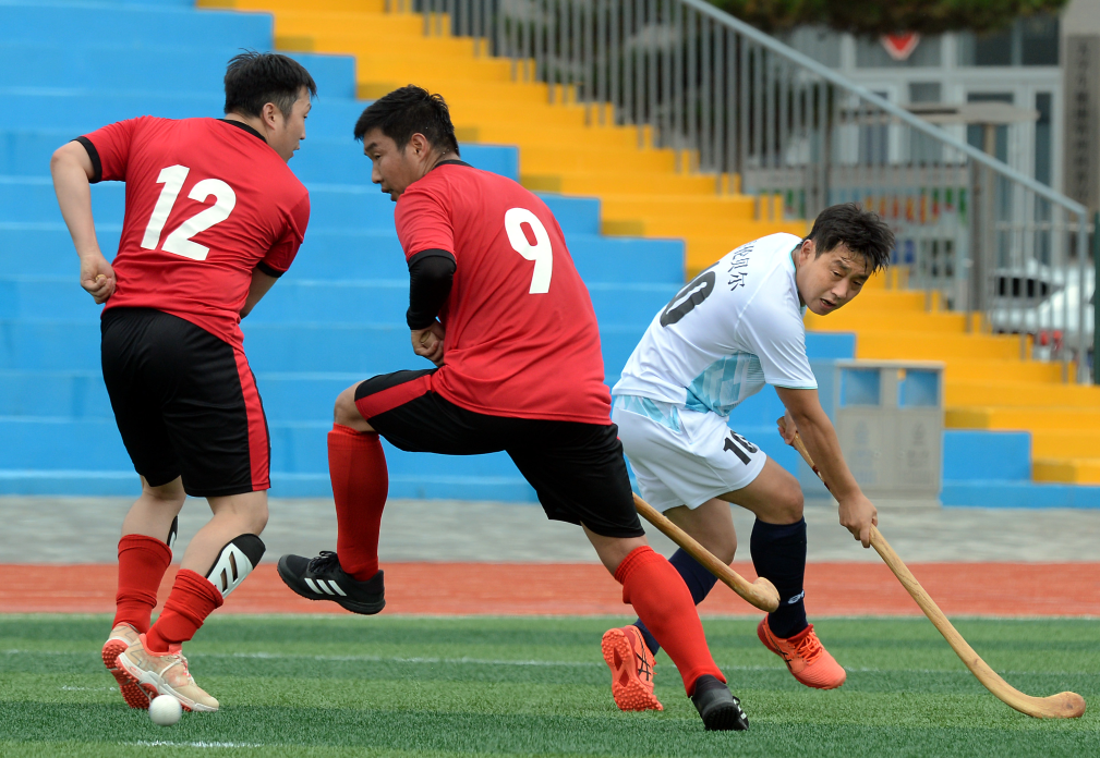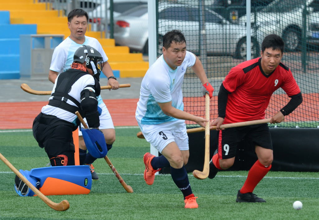 7月29日,呼伦贝尔市代表队的选手(白)与赤峰市代表队的选手在拼抢。