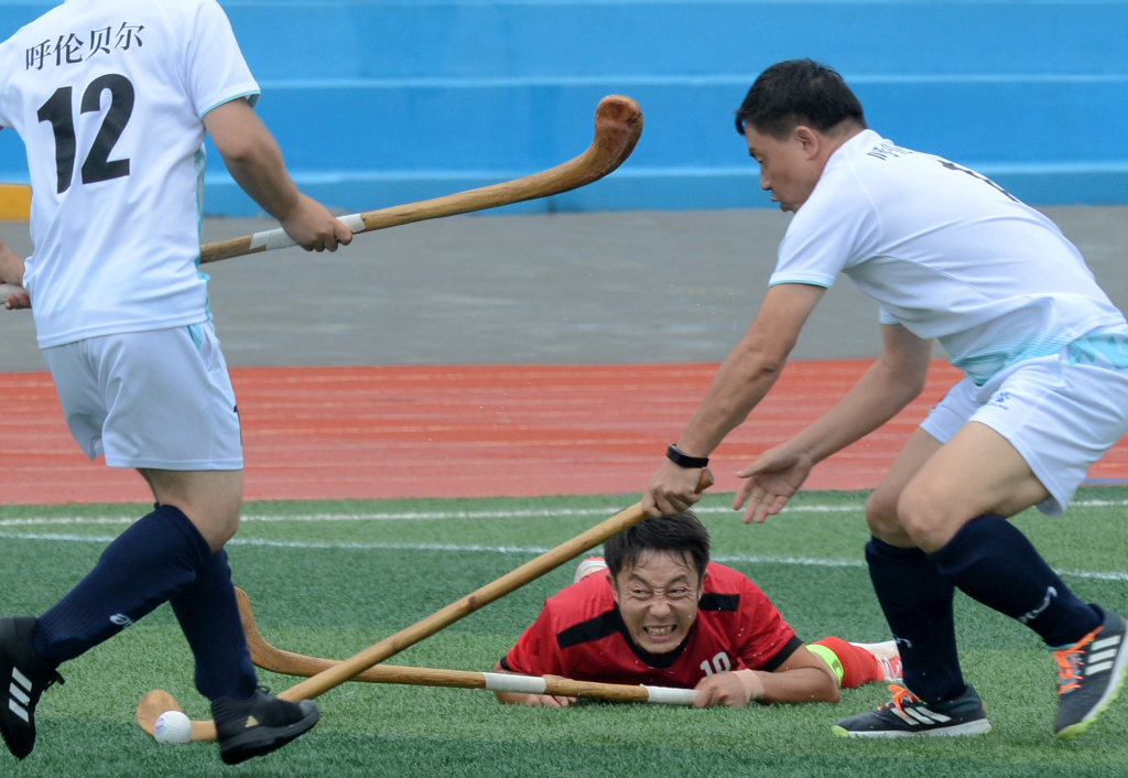 7月29日,呼伦贝尔市代表队的选手(白)与赤峰市代表队的选手在争抢。