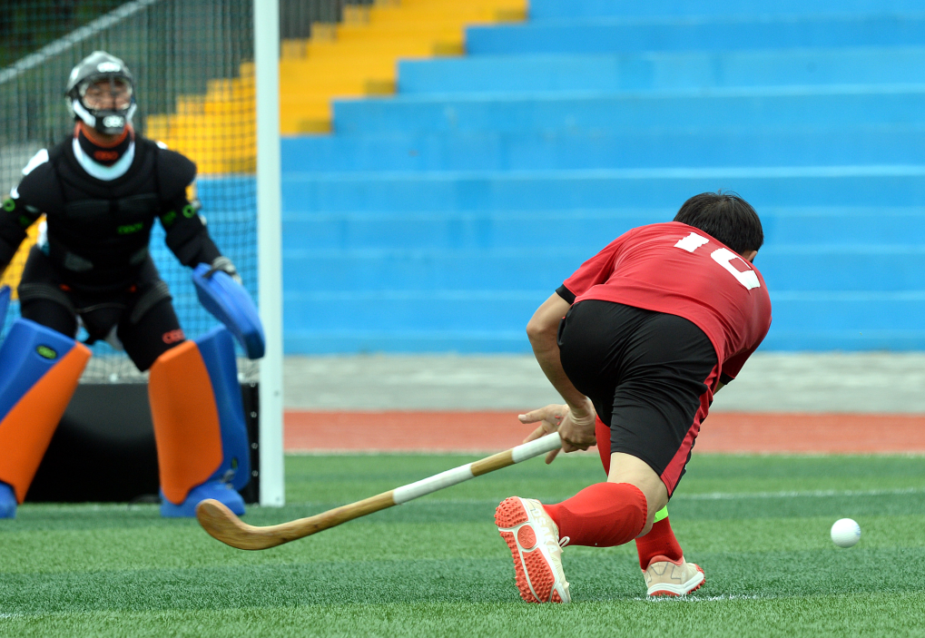 7月29日,一名赤峰市代表队的选手在比赛中大力射门。