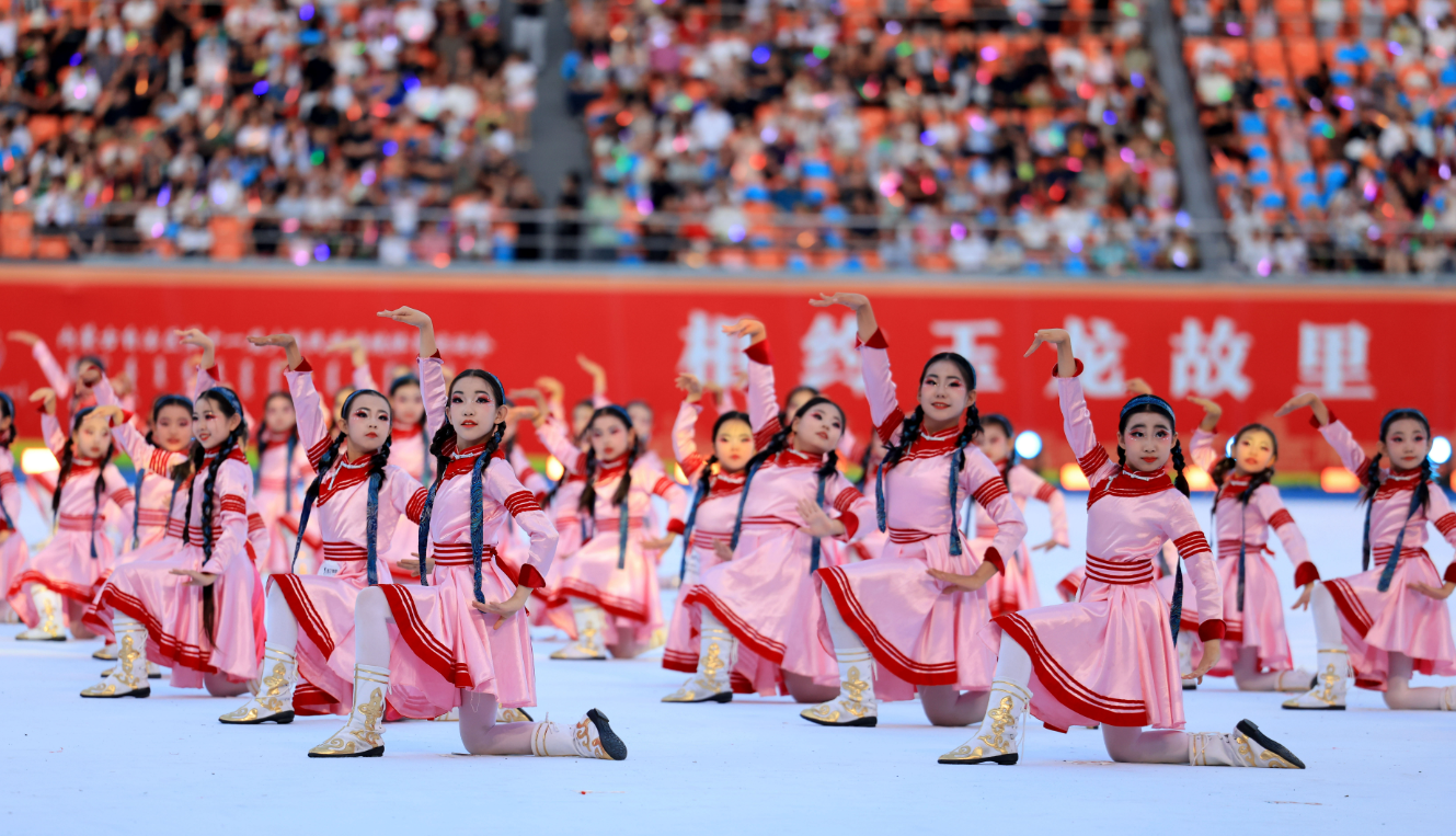 7月30日晚,演员在内蒙古自治区第十一届少数民族传统体育运动会民族大联欢文体展演活动中表演。新华网发(康文魁 摄)