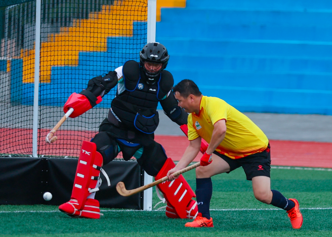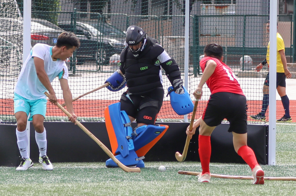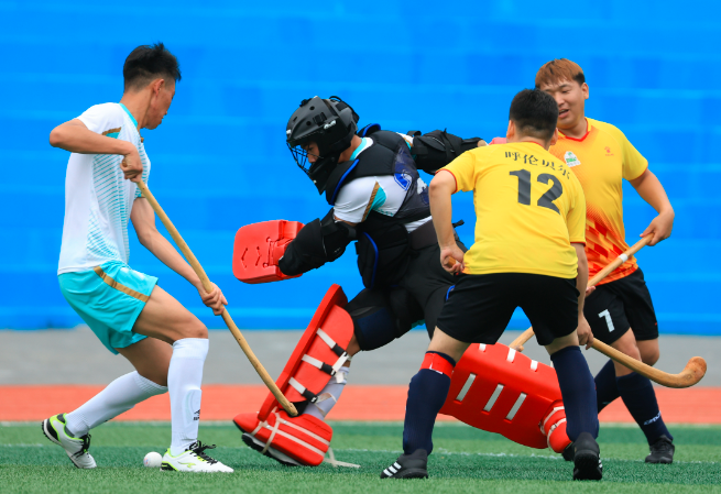 7月28日,鄂尔多斯市代表队守门员(左二)在比赛中出击解围。康文魁 摄