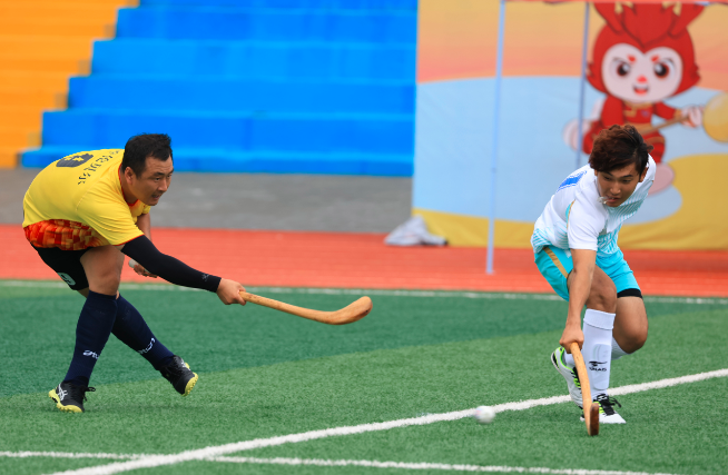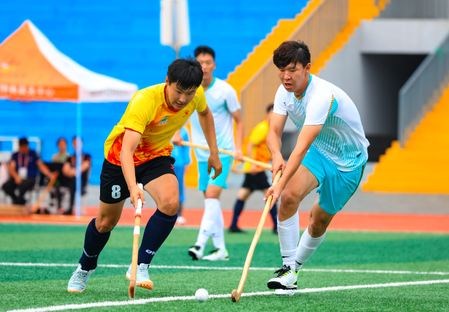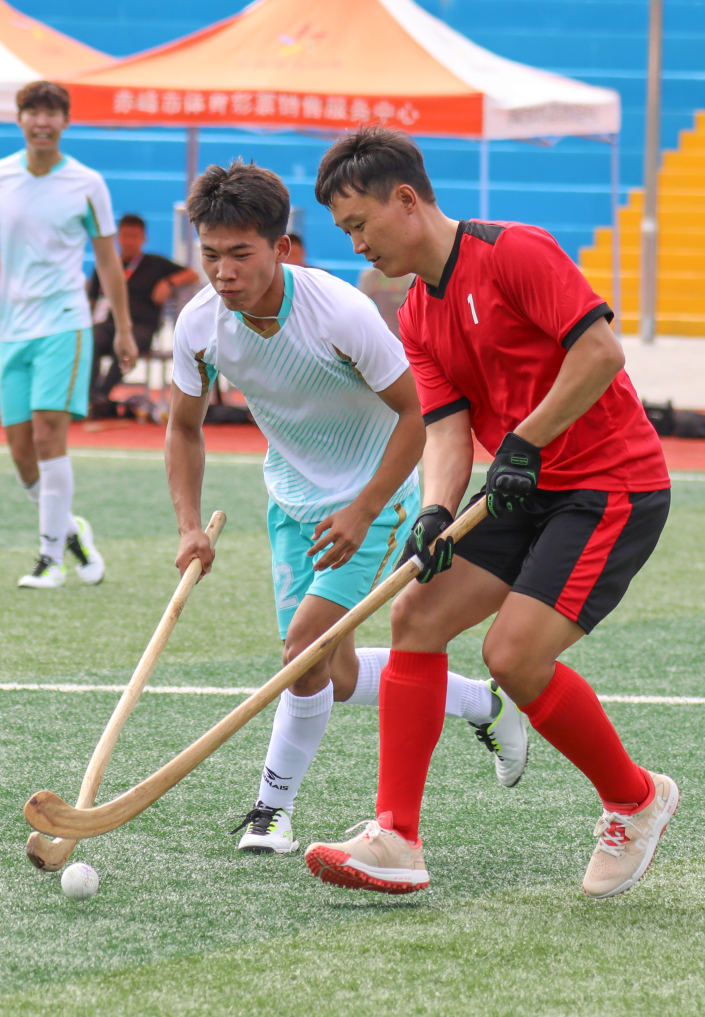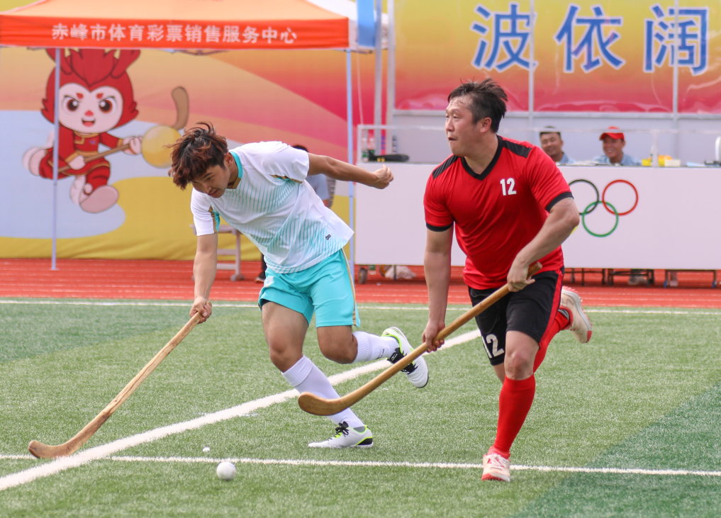 7月28日上午,内蒙古自治区第十一届少数民族传统体育运动会波依阔项目在位于赤峰市松山区的内蒙古交通技术学院体育场继续进行,呼伦贝尔市代表队9比4战胜鄂尔多斯市代表队。呼伦贝尔市代表队球员(左)与鄂尔多斯市代表队球员在比赛中拼抢。康文魁 摄