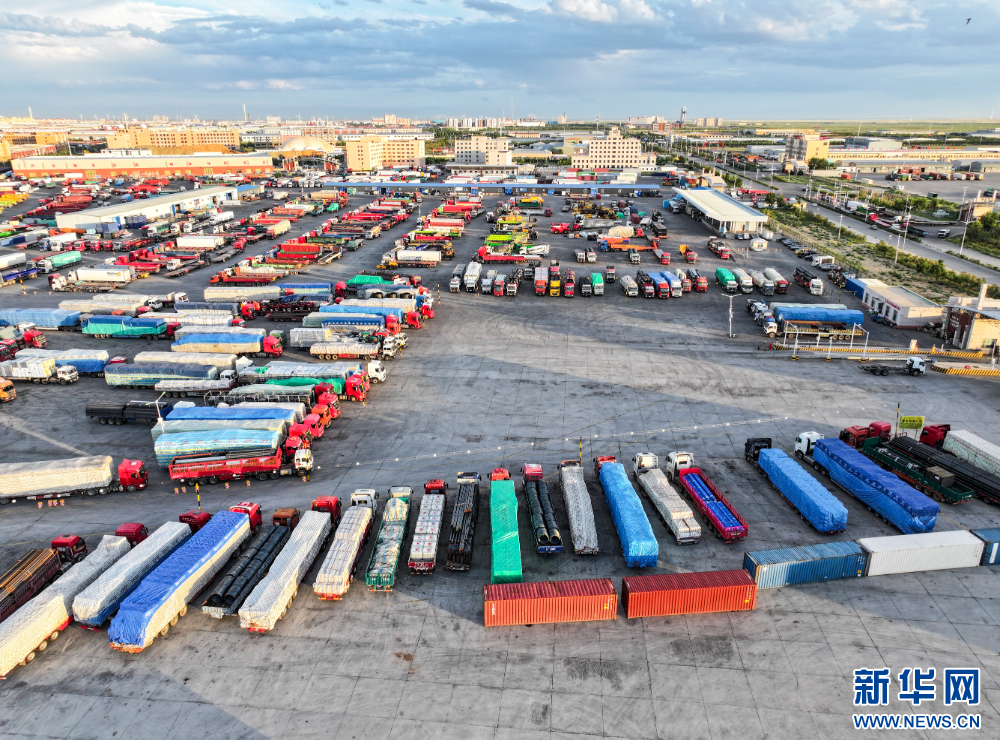 8月1日,二连浩特市环宇物流园区内等待通关的货运车辆。新华网发(郭鹏杰 摄)
