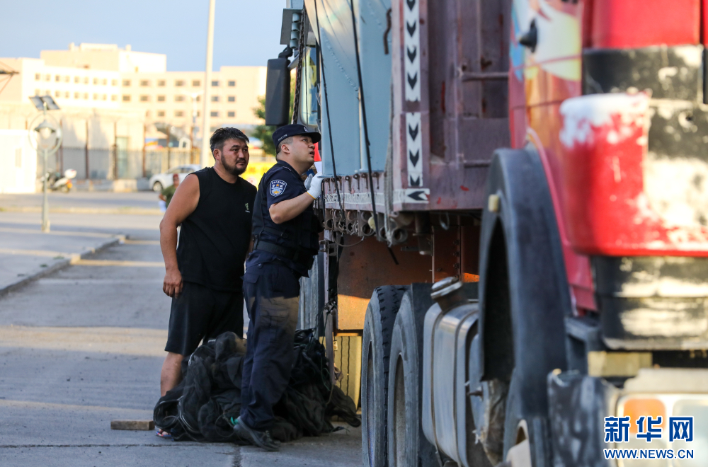 8月1日,二连出入境边防检查站移民管理警察检查货车司机通关证件。新华网发(郭鹏杰 摄)