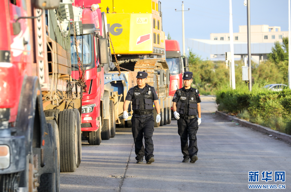 8月1日,二连出入境边防检查站移民管理警察检查出境货车车体。新华网发(郭鹏杰 摄)