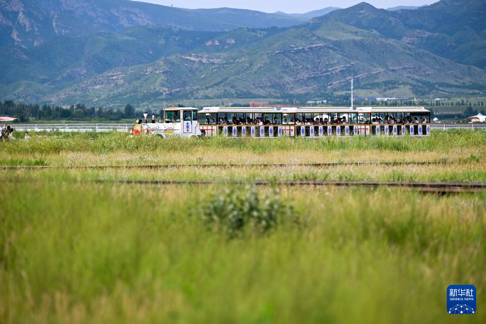 8月3日,游客在呼和浩特市敕勒川草原乘坐观光车游玩。