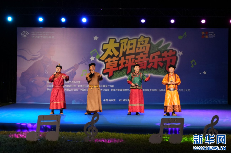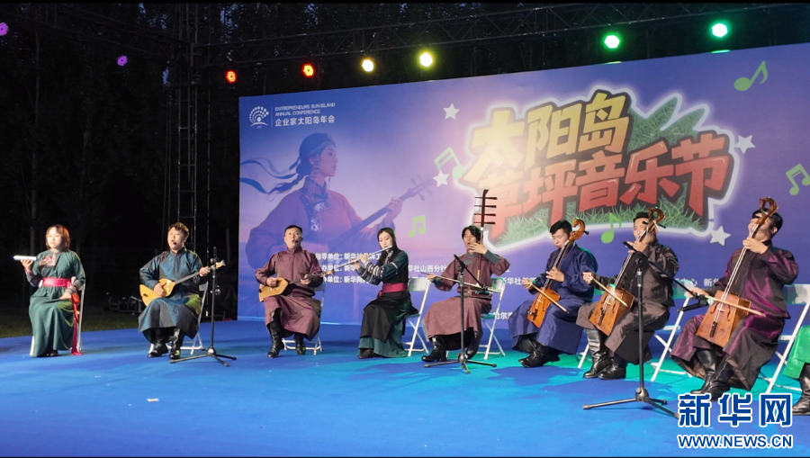 太阳岛草坪音乐节现场,乌兰察布市察右后旗乌兰牧骑队员表演呼麦。新华网发(王伟 摄)