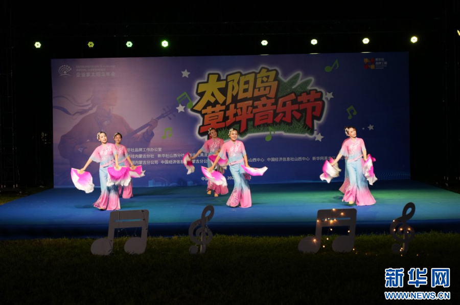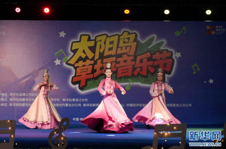 太阳岛草坪音乐节现场,乌兰察布市察右后旗乌兰牧骑队员表演《顶碗舞》。新华网发(王伟 摄)