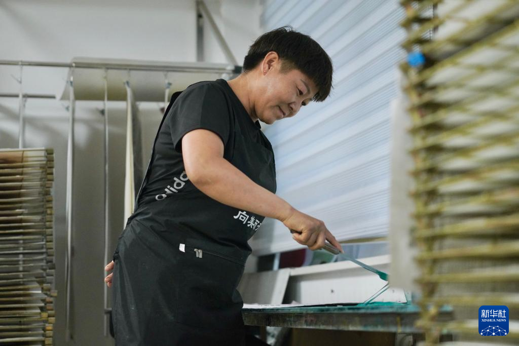 8月10日,在内蒙古扎鲁特旗版画院,画家陈其木格展示她的版画作品《草原艺韵》。