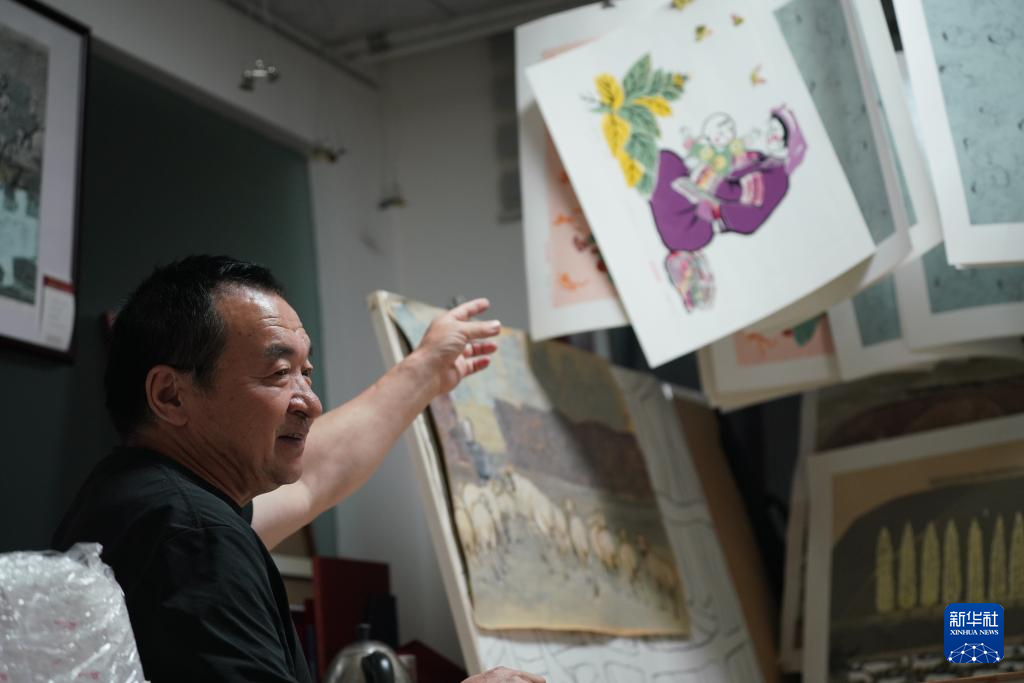 8月10日,在内蒙古扎鲁特旗版画院,扎鲁特版画代表性传承人照那木拉展示自己的作品。