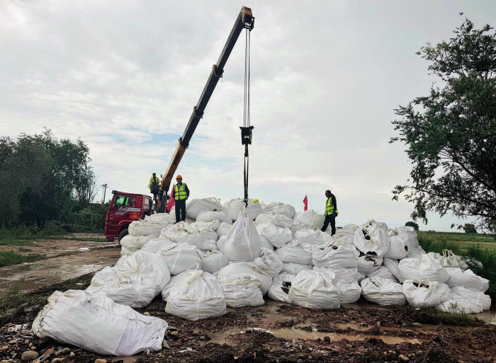 内蒙古包头市土默特右旗的抢险人员加快调运吨包等防汛物资(2025 年 8 月 10 日摄) 王靖摄 / 本刊