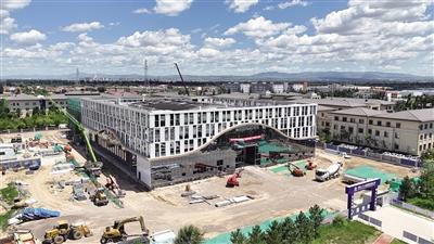 在航空总部基地项目现场,施工有序进行。项目建设单位负责人张蕊介绍,项目主要建设包含办公、会议、培训、食宿等功能的综合业务用房及航材管理附属设施。目前主体已封顶,正进行二次结构施工。