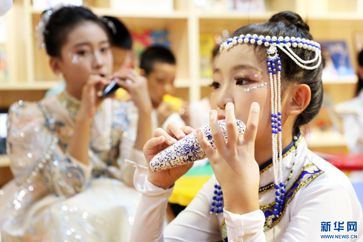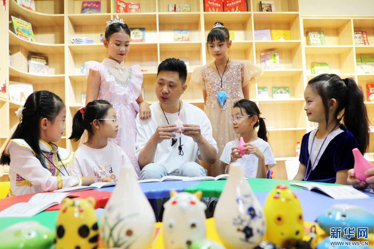 8月19日,在内蒙古扎兰屯市新华书店活动室,学生们练习陶笛演奏技巧。新华网发(韩颖群 摄)