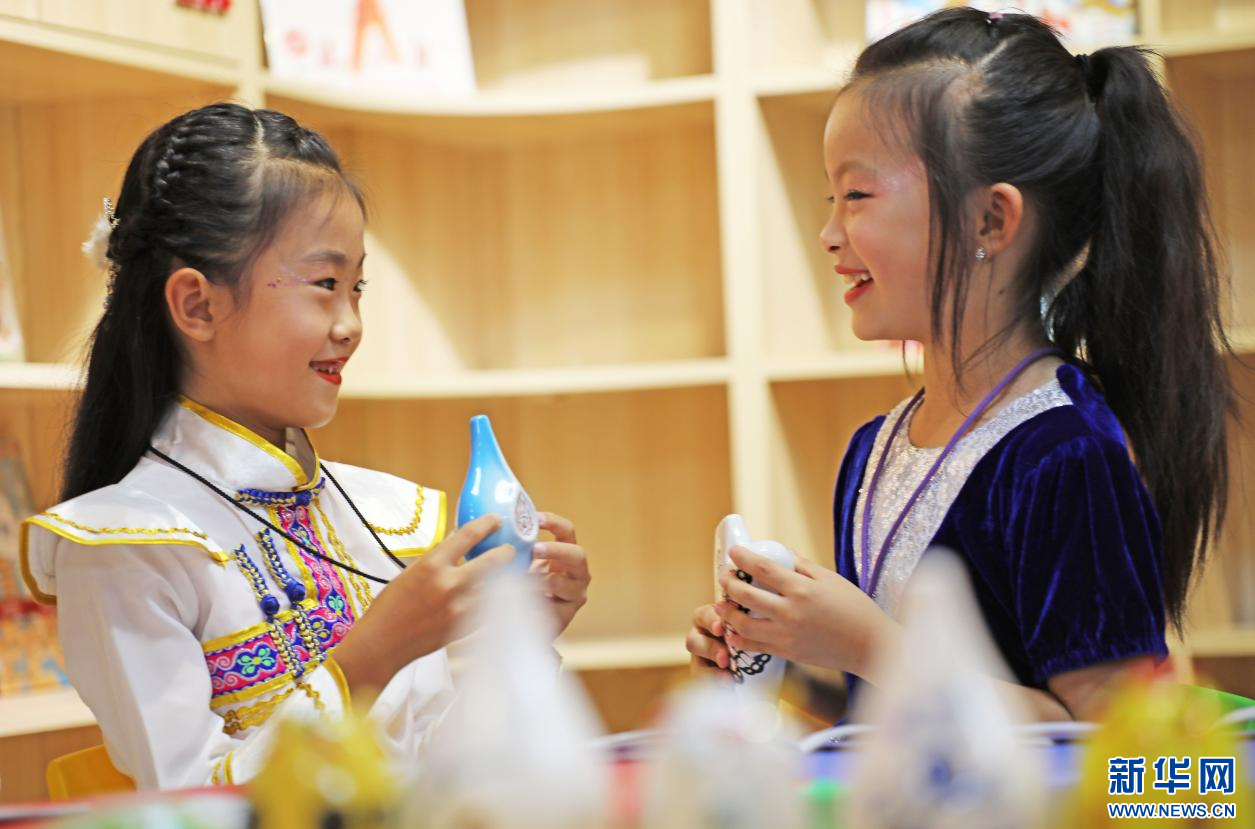 8月19日,在内蒙古扎兰屯市新华书店活动室,小朋友交流陶笛演奏技巧。新华网发(韩颖群 摄)