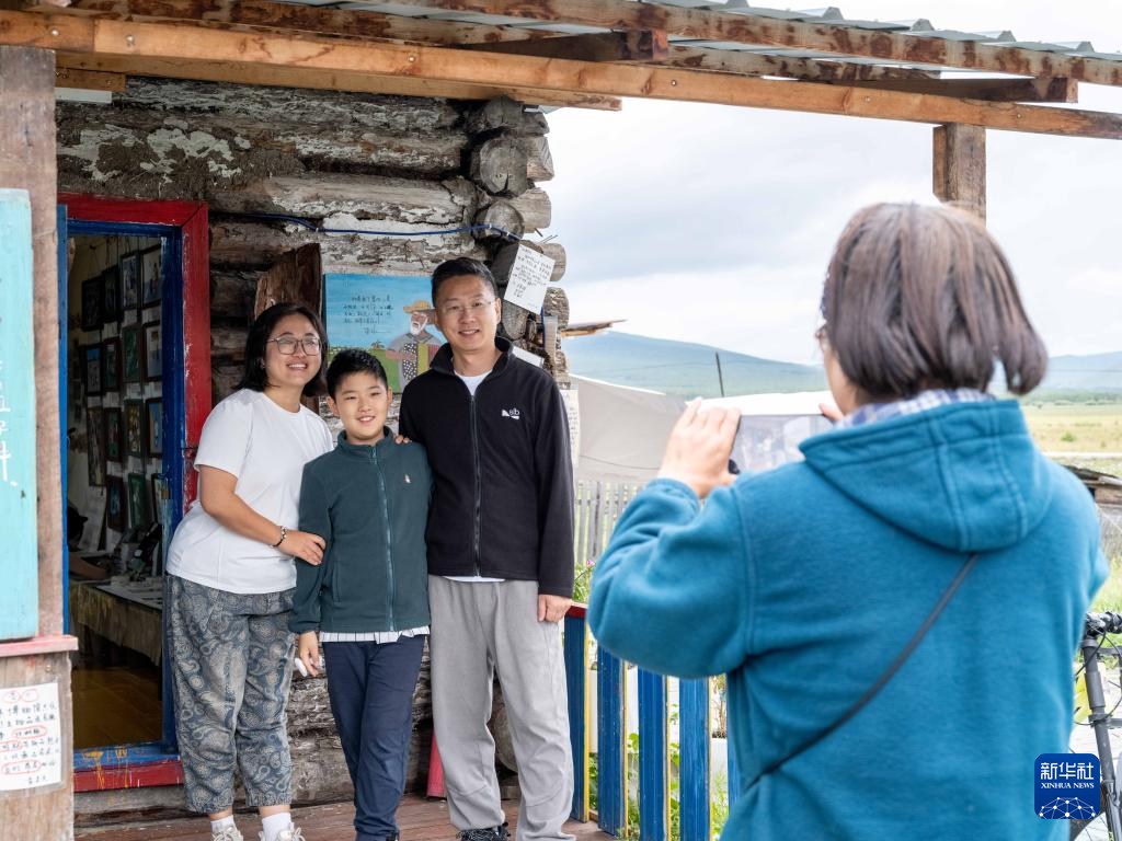 8月21日,在内蒙古恩和俄罗斯族民族乡,游客在当地传统民居木刻楞前拍照留念。