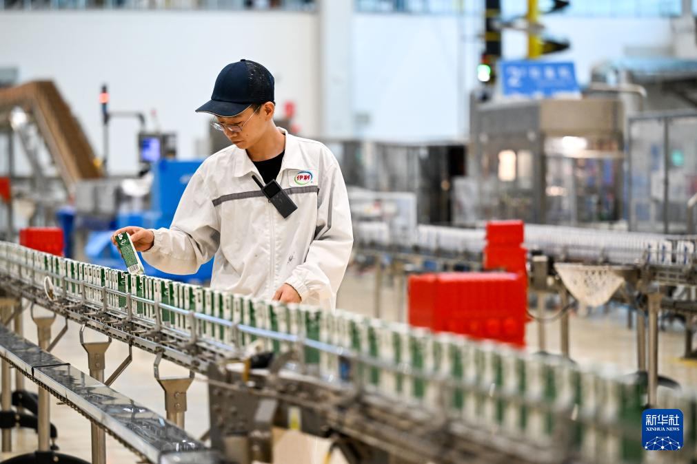 呼和浩特市伊利现代智慧健康谷液态奶全球智造标杆基地,工人在检查奶制品包装(7月28日摄)。