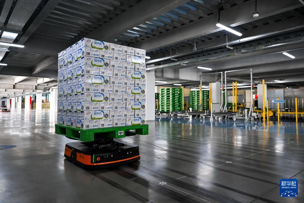 呼和浩特市伊利现代智慧健康谷液态奶全球智造标杆基地,智能搬运机器人在运送奶制品(7月28日摄)。
