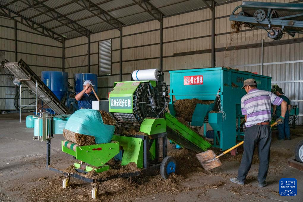 8月1日,蒙源农牧业集团有限公司工人在加工打包全混合日粮。
